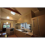キッチンとリビングの間仕切り戸をハイカウンターに変更。傾斜天井や天窓、床暖房や掘炬燵を設け、漆喰塗の内装仕上げにより、明るく風通しの良い、エアコンの要らない部屋となり、暗い・夏暑い冬寒いから開放されました。