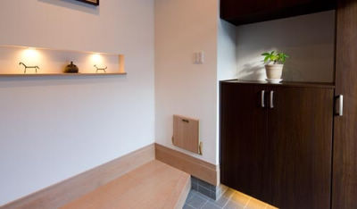 玄関の腰掛けスペースは、靴の脱ぎ履きや荷物置きなど用途はいろいろ。