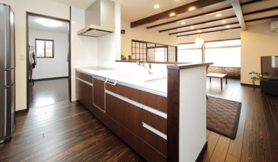 ご両親の家を引き継いだW様は、思い出を大切に残しつつ、これからのライフスタイルに合う家への大幅なリフォームがご希望でした。キッチンなどの水廻り設備はすべて最新のものに変え、暮らしの快適さを追求。和室が並ぶ1階は、床の間のある和室だけを残して開放感のある空間につくり替えました。思い切った間取り変更により、大空間のリビングが実現。天井は化粧梁が見えるデザインで古民家の雰囲気が楽しめます。「次世代まで快適に暮らせますね」と生まれ変わった家を眺めて幸せそうなW様です。