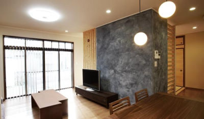 中古住宅を購入し、リフォームされたK様は「細かく部屋割りされた間取りを開放感のある空間に変えたい」とお考えでした。構造上、撤去できない壁には縦格子などのデザインを施してアクセントとして活用。ポイントとして一部の壁面を水墨画調にして、モダンな趣のリビングが完成です。和室とリビングは、格子の向こう側に広がる空間を互いに感じ合えることで、ひとつの空間としてつながりました。「壁があるからこそ生まれる空間があるのですね」とうれしい驚きを感じられているK様です。