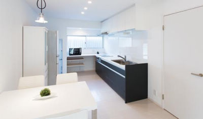 白の内装で統一し、明るい清潔感のあるダイニングを実現。