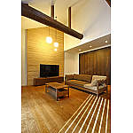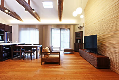 ご夫婦が1階フロアーだけで生活できるように設計。丸太梁が大空間のアクセントに良く効いています。2世帯にも備えた間取りで。