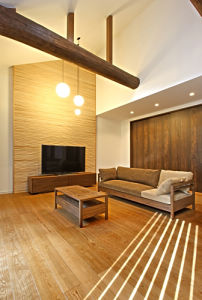 アクセントウォールの陰影がとても美しいリビングルーム。建築化照明で杉板が織り成すさざ波模様が幻想的。