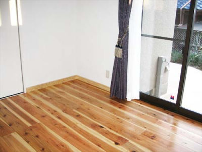 寝室にする部屋は自然素材にこだわりました。杉のムク材の床板は小さなお孫さんも「気持ちいい!」と言ってゴロゴロ寝転ぶそうです。壁と天井の珪藻土は、芸術家の奥様のこだわりの壁となりました。