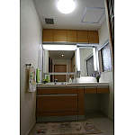メイクもできる洗面ドレッシング。洗面と浴室間仕切りFIX窓にフィルムを貼り、あかり取り。