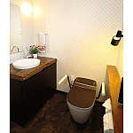 たっぷりスペースを確保したトイレ。書籍好きなご夫婦がここでもゆっくり読書ができるようにとスポットライトや棚を設け、まるで小さな図書館になりました。