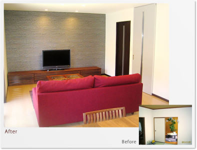 壁の一部にアクセントをつけたかったので、クロスの色を変えてみました。モダンで、重厚感がある感じに仕上がりました。