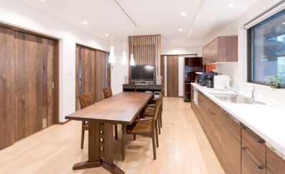 また、キッチンの扉柄やドア等の建具はウォールナット材で統一。深みのあるブラウンは、「一目惚れでした」とK様がおっしゃるとおり、空間全体の雰囲気をシックにまとめ上げ、美しい木目が温もりを感じさせてくれます。リビングも同じ素材でモダンな縦格子スクリーンをしつらえ、動線をすっきりと整理しました。「家の悩みが一度に解決できました」と、K様ご夫妻は大変満足のご様子です。