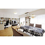 持てあましていた和室の一室はLDKに変更。南向きの窓から陽光がたっぷり射し込みます。新たに取り付けた壁面収納の一角にはカウンターデスクを造作、ご主人が趣味の音楽を聴いたり、パソコン作業ができる書斎スペースを設けました。