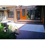 LDKから外へのつながりを考え、一体感を出すためのデッキ。アプローチは樹脂洗い出しとコンクリート金ゴテ押さえ。