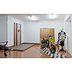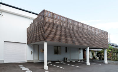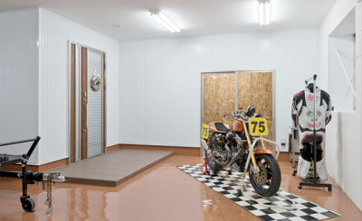外壁は白を基調にブラウンの木製ルーバーをアクセントにして、倉庫だったとは思えないほどおしゃれでモダンなルックスに生まれ変わらせました。1階の車庫は、ご主人の趣味だというバイクのお手入れもゆったりできるプライベートガレージへと変わり、大満足のご様子です。