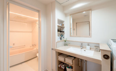 お子さまが独立されたことをきっかけに、ご自宅のマンションを長年計画してきた「終の棲家」としてリフォームしたH様。まず大きなご要望の一つが、奥様がお好きな雑貨が似合うカフェ風の空間にしたい、というものでした。「白を基調にしたいと決めてました」と語る奥様は、キッチンや収納を清潔感のあるホワイトで統一。マットな磁器質タイルや光沢のある素材など、質感の異なるマテリアルも空間に深みを与えてくれています。