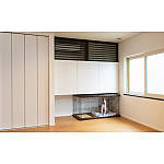 空間全体は既存のリビングに合わせたモダンな洋室にコーディネート。床はワンちゃんの足元に優しく負担が少ないよう、防滑性・耐傷性のあるコルク材を採用しました。また、既存の押し入れは建具を変え、そのままワンちゃん周りのグッズがたっぷり収納できるクローゼットに。床の間だった場所にも収納を設け、ケア用品やドッグフードのストック等も収納が可能になりました。今ではすっかりワンちゃんの憩いの場となっているようです。