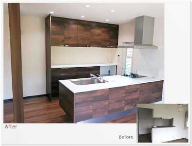 フルフラットの対面キッチンになりリビングとひとつの空間になりました。収納も充分にあるので全て片付きます。構造上抜けない柱をアクセントとして少しだけ目隠し。