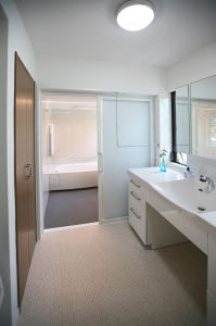 スイスしっくい・モザイクタイルとオークのオークの木目を生かしてナチュラルなイメージに仕上げ、ライティングにも工夫をしています。