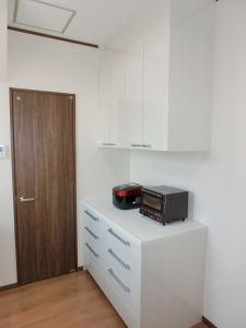 カップボードは、吊り戸棚も通常の奥行き375㎜から450㎜に、高さも700㎜から840㎜に変更し取り付ける高さも低く設定。吊り戸棚の下半分は十分収納として使えるように考えました。