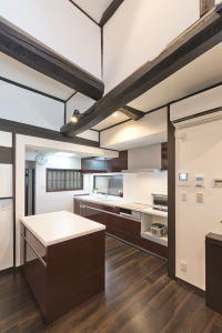 伝統ある古民家を「古民家カフェのようにしたい」とのご要望だったS様。天井をなくし丸太梁の味わいを活かしたLDKはキッチンと一体感のある大空間に変身。足元も床暖房で暖かく、古民家特有の寒さも和らぎます。明るさと使い勝手が増したキッチンも「家族とコミュニケーションできてお料理が楽しい」と奥様お気に入りの場所。冷たい印象だった土間の玄関は、式台を2段にすることで段差を解消。お客様が長居できるコミュニティスペースに生まれ変わりました。