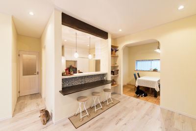 そのキッチンとなったのは、かつて納戸だった場所。収納が少なく、デッドスペースが多かったその場所にすっぽりと収まるよう、キッチンを新設しました。さらに、ダイニングはナチュラルな印象のアーチ状にし、リビングやキッチンから視覚的に独立した空間に。キッチンから直線でつながる勝手口の手前には、食品庫として重宝するパントリーを設けています。