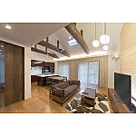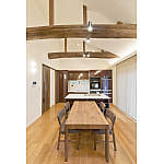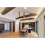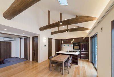 当初は全面リフォームのご予定でしたが、住まい全体をリニューアルし、1階のみでも生活できる家へと建替を行ったY様。住まいの中心となるLDKは全体を吹き抜けとし、ゆったりと広がる大空間が生まれました。その吹き抜けを見上げてもっとも印象的なのが、存在感のある丸太梁。「昔住んでいた茅葺きの古民家をイメージした」Y様。LDKのアクセントとなっています。のびのびとくつろげる広いLDKに、古き良き住まいの面影が加わり、あたたかみのある表情に仕上がっています。