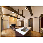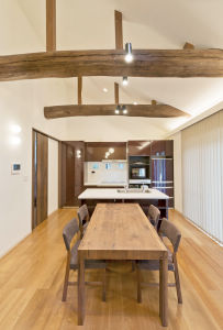 当初は全面リフォームのご予定でしたが、住まい全体をリニューアルし、1階のみでも生活できる家へと建替を行ったY様。住まいの中心となるLDKは全体を吹き抜けとし、ゆったりと広がる大空間が生まれました。その吹き抜けを見上げてもっとも印象的なのが、存在感のある丸太梁。「昔住んでいた茅葺きの古民家をイメージした」Y様。LDKのアクセントとなっています。のびのびとくつろげる広いLDKに、古き良き住まいの面影が加わり、あたたかみのある表情に仕上がっています。