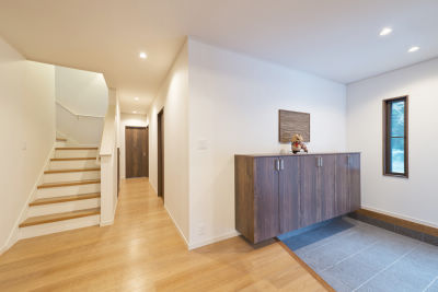 高い天井と広い通路幅でゆったりとした玄関ホール。