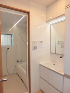サイドには300幅のトール収納を採用したことで、並んでいた小物も収納することができ、すっきりした洗面台になりました。