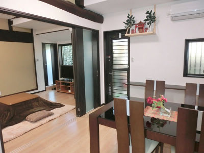 和室2間をリビングとしてリフォーム。キッチン後ろにカップボードを配置することにより日常使う食器類もすっきり収納。また、家事動線が短く効率的になった。