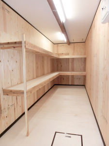 2階への階段を取り除き、床、壁、天井共、ベニヤで仕上げ棚も新設。