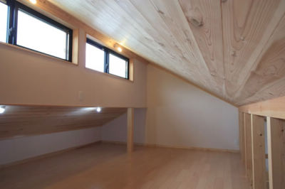 傾斜天井は野地板で断熱効果を高めました。また透湿性のある防水シートや断熱材の採用で、さらに通気層の工夫もしました。南面の窓から光を取り入れ、2階だけでなく1階まで明りを通すことが出来ました。