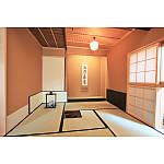 露地を通って、躙口(にじりぐち)から茶室に入る本格的な4畳半のお茶室。壁には剥落防止の為に紙をはりました。(腰貼)