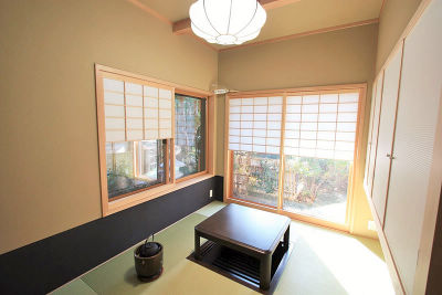 露地を通って、躙口(にじりぐち)から茶室に入る本格的な4畳半のお茶室。壁には剥落防止の為に紙をはりました。(腰貼)