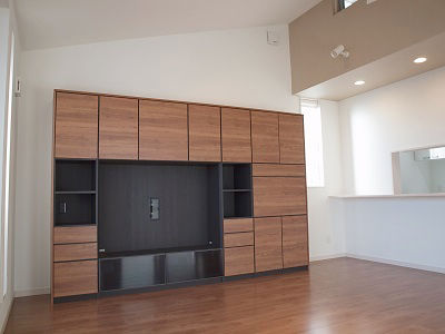 建具とフローリングの色を合わせて落ち着いたリビングに。