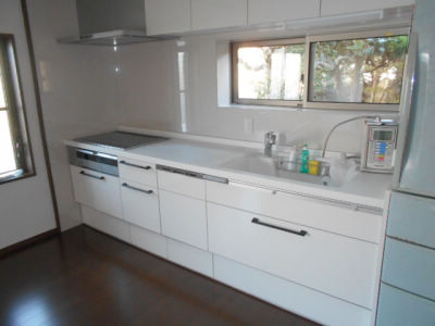 タイル貼りのキッチン前面の壁をパネル貼りにし、クロスを張り替えた事で、お掃除のしやすい明るいすっきりとしたキッチンになった。