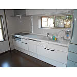 タイル貼りのキッチン前面の壁をパネル貼りにし、クロスを張り替えた事で、お掃除のしやすい明るいすっきりとしたキッチンになった。