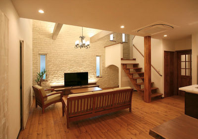 アクセントのブリックタイルの陰影が美しいリビングルーム。