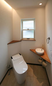 1階のトイレは、漆喰塗りの天井と壁にタイル貼りの床、照明はコーニス照明とこだわった空間に。2階のトイレは、1階とは違った印象のかわいらしい空間に仕上げました。