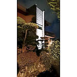 広い庭に沢山の木々が生い茂り、夜は真っ暗になる為、不安なく歩ける為の灯りプランをご提案させて頂いた。足元の不安をなくす為にアプローチにはエントランスライトで暗い足元を明るくすると共に、建物にはスポットライトをあて、幻想的な雰囲気に仕上げた。クリスマスシーズンに向け、幾つかの木をライトアップさせる為の電源確保工事も併せて施工した。