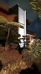 広い庭に沢山の木々が生い茂り、夜は真っ暗になる為、不安なく歩ける為の灯りプランをご提案させて頂いた。足元の不安をなくす為にアプローチにはエントランスライトで暗い足元を明るくすると共に、建物にはスポットライトをあて、幻想的な雰囲気に仕上げた。クリスマスシーズンに向け、幾つかの木をライトアップさせる為の電源確保工事も併せて施工した。
