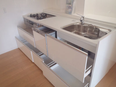 リフォーム前は開きの収納だった為、出し入れがし辛く、収納の足りなかった為キッチン下の収納を全てスライドタイプにしました。スライド収納にする事で、開き収納と比べてデッドスペースが少なく、出し入れも立ったまま出来て楽です。また、お客様が見えた時に食器を洗うのが大変なので、奥様のご希望でビルとイン食洗機を設置しました。