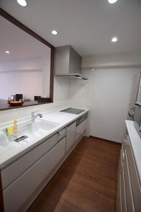 築年数から水廻りの設備が老朽化していた。使い勝手や、掃除のしやすさ等を考慮し、キッチンはラクシーナ2400、洗面台はウツクシーズ900、浴室はオフローラ1316を採用。照明はダウンライトを配置し、すっきりさせた。