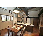 ここにも堂々たる梁が。落ち着いた雰囲気を大切にしたダイニングキッチン。またIHヒーター、食洗機、フォンテ等最新設備を採用。どうしても抜けない柱を利用してキッチン側面の壁裏にちょっとした収納をつくってみました。物であふれていたキッチン廻りはサイドのカップボードですっきり収納。