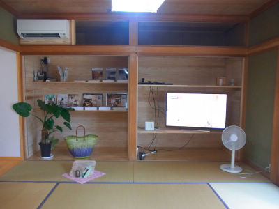 この中古物件に決めたのは、広い庭を眺められる縁側があったから!!その縁側や玄関、ダイニングキッチンなどを無垢の杉浮造りの床材に張替え、素足で歩くのが心地いいです。壁のタイルの色選びには時間がかかったし、漆喰壁塗りにも挑戦し大変でしたが、仕上がりは大満足です!キッチン(センサー水栓、PaPaPaシンク)の使い勝手にも大満足!!