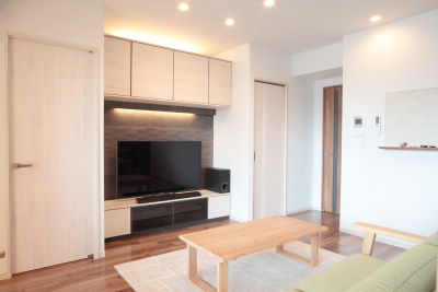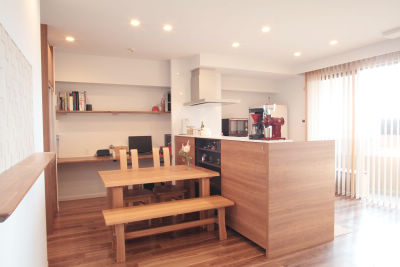 自分達らしいこだわりを形にするために、中古マンションを購入してリフォームされたM様。閉鎖的な印象だったキッチンは思い切って南側に移動し、垂れ壁を取り払ってオープンに。ダイニングのカップボードもキッチンと統一し、勉強机を兼ねたスタディコーナーをしつらえるなど、空間を有効に活用しました。リビング壁面にはカウンターを設け、目を引くアクセントウォールをプラス。家族に笑顔が絶えない、こだわりいっぱいの住まいが出来上がりました。