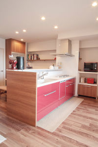 「お料理が楽しみになりました」と奥様。キッチン扉のレッドはこだわりの一つ。