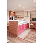 「お料理が楽しみになりました」と奥様。キッチン扉のレッドはこだわりの一つ。