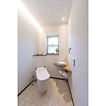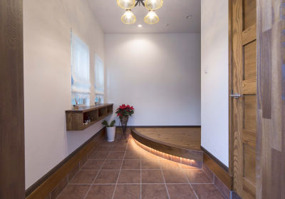 奥様のご実家を譲り受けリフォームを計画されたK様。構造部分までかなり老朽化が進んでいたため、建替えをすることに。新しい住まいのテーマは、奥様ご希望の「フレンチハウス」。リビングには大きな吹き抜けを設け、2本の化粧梁と間接照明でさりげない上質感を演出。壁と天井は素朴な質感で、調湿機能にも優れた漆喰壁とし、吹き抜けの壁は陰影が美しいブリックタイルを採用しています。足元もボルドーパインの無垢フローリングと、自然素材をふんだんに盛り込んだ贅沢な空間に仕上げました。