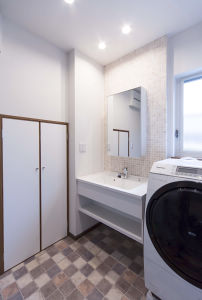 奥様のご実家を譲り受けリフォームを計画されたK様。構造部分までかなり老朽化が進んでいたため、建替えをすることに。新しい住まいのテーマは、奥様ご希望の「フレンチハウス」。リビングには大きな吹き抜けを設け、2本の化粧梁と間接照明でさりげない上質感を演出。壁と天井は素朴な質感で、調湿機能にも優れた漆喰壁とし、吹き抜けの壁は陰影が美しいブリックタイルを採用しています。足元もボルドーパインの無垢フローリングと、自然素材をふんだんに盛り込んだ贅沢な空間に仕上げました。