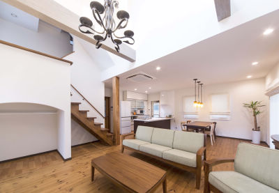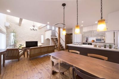 奥様のご実家を譲り受けリフォームを計画されたK様。構造部分までかなり老朽化が進んでいたため、建替えをすることに。新しい住まいのテーマは、奥様ご希望の「フレンチハウス」。リビングには大きな吹き抜けを設け、2本の化粧梁と間接照明でさりげない上質感を演出。壁と天井は素朴な質感で、調湿機能にも優れた漆喰壁とし、吹き抜けの壁は陰影が美しいブリックタイルを採用しています。足元もボルドーパインの無垢フローリングと、自然素材をふんだんに盛り込んだ贅沢な空間に仕上げました。
