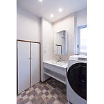 奥様のご実家を譲り受けリフォームを計画されたK様。構造部分までかなり老朽化が進んでいたため、建替えをすることに。新しい住まいのテーマは、奥様ご希望の「フレンチハウス」。リビングには大きな吹き抜けを設け、2本の化粧梁と間接照明でさりげない上質感を演出。壁と天井は素朴な質感で、調湿機能にも優れた漆喰壁とし、吹き抜けの壁は陰影が美しいブリックタイルを採用しています。足元もボルドーパインの無垢フローリングと、自然素材をふんだんに盛り込んだ贅沢な空間に仕上げました。