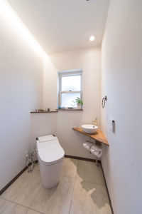 奥様のご実家を譲り受けリフォームを計画されたK様。構造部分までかなり老朽化が進んでいたため、建替えをすることに。新しい住まいのテーマは、奥様ご希望の「フレンチハウス」。リビングには大きな吹き抜けを設け、2本の化粧梁と間接照明でさりげない上質感を演出。壁と天井は素朴な質感で、調湿機能にも優れた漆喰壁とし、吹き抜けの壁は陰影が美しいブリックタイルを採用しています。足元もボルドーパインの無垢フローリングと、自然素材をふんだんに盛り込んだ贅沢な空間に仕上げました。